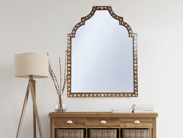 This graceful mirror combines traditional Syrian inlay techniques with a modern aesthetic. Its handcrafted walnut frame is adorned with mother-of-pearl vine motifs, creating a piece that is both functional and artistic. It works beautifully in bedrooms or living rooms as a statement accessory.