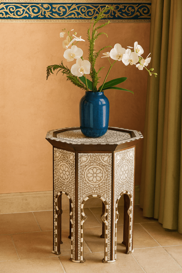 This octagonal side table showcases the mastery of Syrian artisans. Handcrafted with geometric floral mother-of-pearl inlays set against walnut wood, this table embodies the traditional Damascene style. Its eight-sided design makes it both functional and artistic, a perfect addition to any living space.