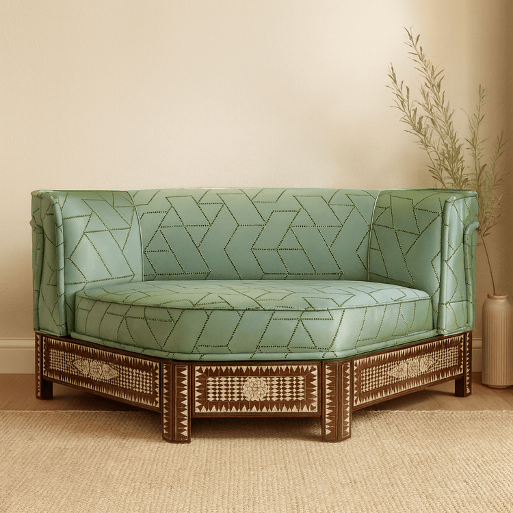This piece anchors your seating area with a balance of tradition and modern comfort. Crafted by Syrian artisans, the solid walnut wood frame highlights the handmade quality, while the upholstered seat ensures durability and comfort. Whether used in its traditional role in a Majlas arrangement or as a standalone piece, the corner seating offers versatile design opportunities. The option of green upholstery adds a touch of bold color, creating a visual statement while maintaining the warm tones of the wood.