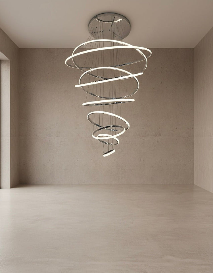 Make a bold architectural statement with this modern spiral LED chandelier, designed especially for high ceilings and double-height spaces. Featuring a flowing multi-ring design suspended at varying levels, this chandelier creates a stunning visual effect from every angle while delivering soft, evenly diffused illumination.