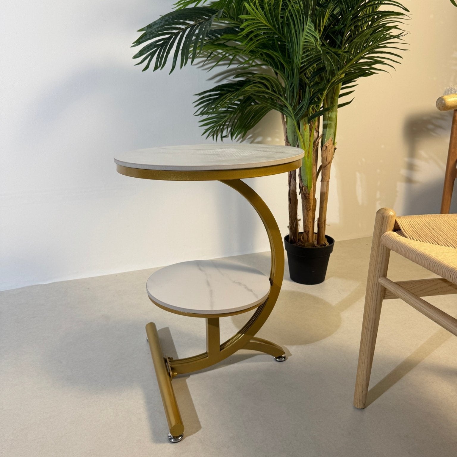 This modern C-shaped design slides partially under the sofa, making it practical for compact layouts. The round surfaces and gold frame add elegance while keeping functionality in focus.