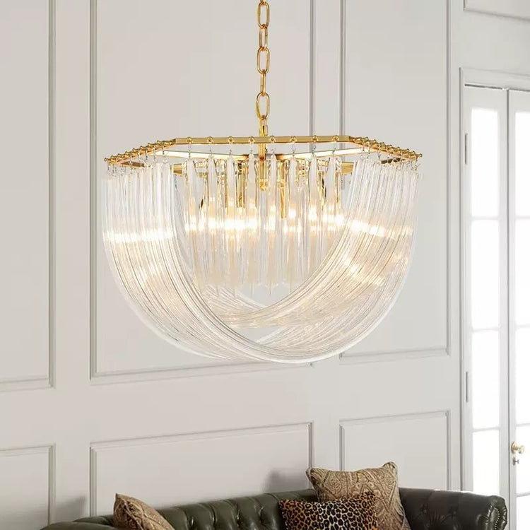 Bring timeless elegance and warm ambiance into your space with the Aurora Crystal Drape Chandelier. Designed with a luxurious gold-finished frame, this statement piece features cascading crystal strands that form a graceful, curtain-like silhouette. The layered crystal detailing softly diffuses light, creating a warm, inviting glow that enhances any interior.