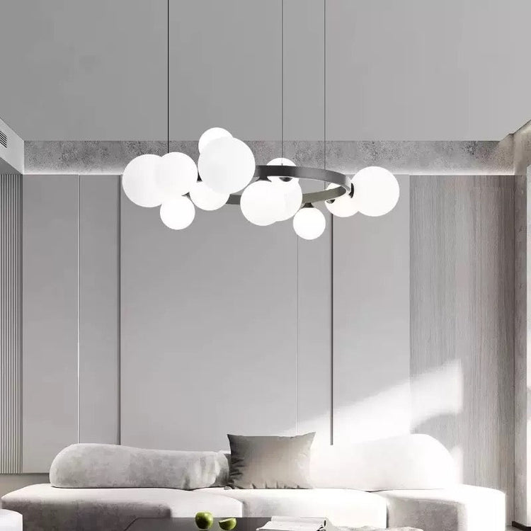 Elevate your interior with the Modern Orbit Globe Chandelier, a striking statement piece designed for contemporary living spaces. Featuring a sleek black circular frame adorned with frosted white glass globes, this chandelier creates a soft, ambient glow while adding sculptural elegance to any room.